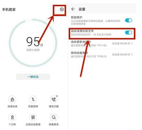 方法:打开【手机管家】—【设置】—开启【自动清理垃圾文件】