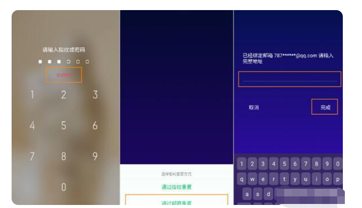 点亮屏幕,连续输入五次密码,提示密码错误,点击忘记密码,选择通过验证邮箱/指纹重置密码,根据提示输入正确验证信息后重新设置密码即可。