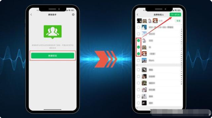 4、点击“新建群发”后,在好友列表中选择想要群发消息的各个聊天对象,最后点“下一步”即可编辑想要发送的消息去发送给他(她)们了!