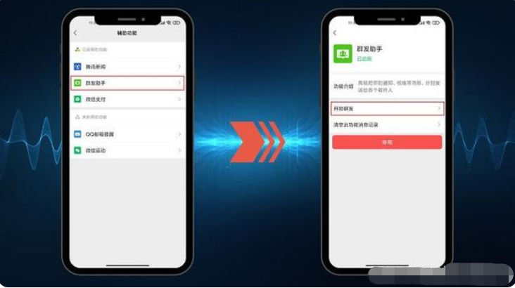3、辅助功能这里有个“群发助手”,我们点进去后选择“开始群发”就可以给多个人发送消息了!