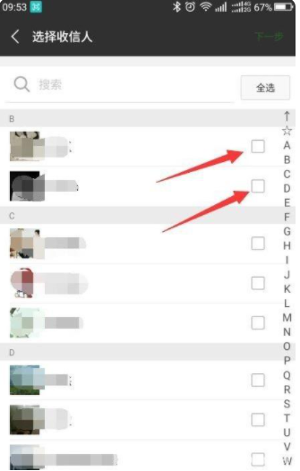 4、点击“新建群发”,弹出选择收信人,对着要群发的朋友们右侧的方框打勾或点击全选,选中所有人。