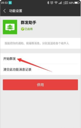 3、进入群发助手,这里可以进行群发,清空记录,也可以停用群发助手。点击“开始群发”。