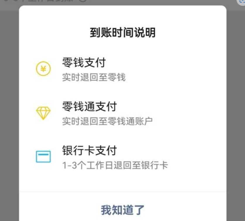 步骤四:此时有两种方式进行选择:“退回零钱”即钱款直接返还零钱账户,可实时到账;“退回原支付方式”到账时间因原支付途径而异,将在0