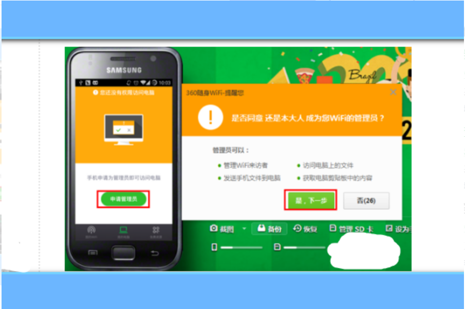 6、点击360wifi手机版下面三个选项中的”我的电脑“,再点击”申请管理员“。