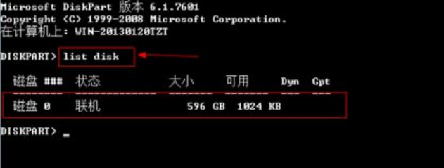 3、启动了diskpart程序后,接着输入list disk,就是把电脑上的硬盘都罗列出来