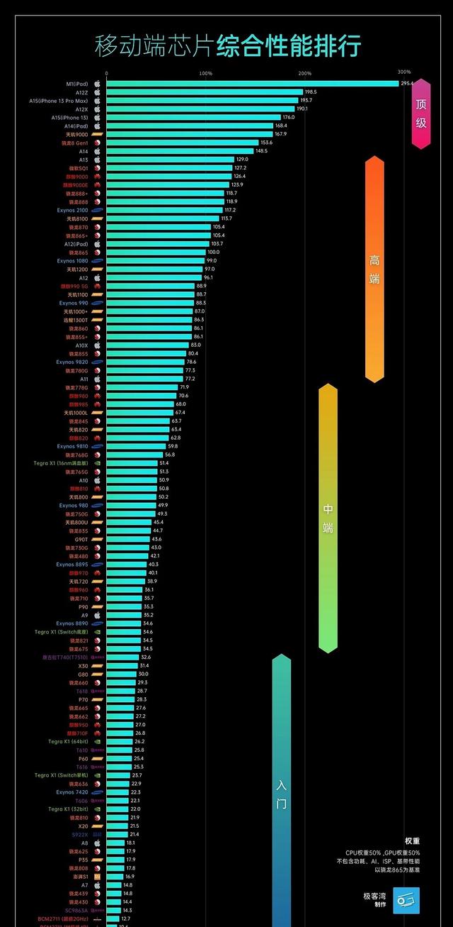 可以看到,顶级处理器基本上被苹果霸榜,不过M1、A12Z、A12X这几款处理器基本上是搭载于平板电脑上面的,手机中最强的处理器应该是苹果A15了。