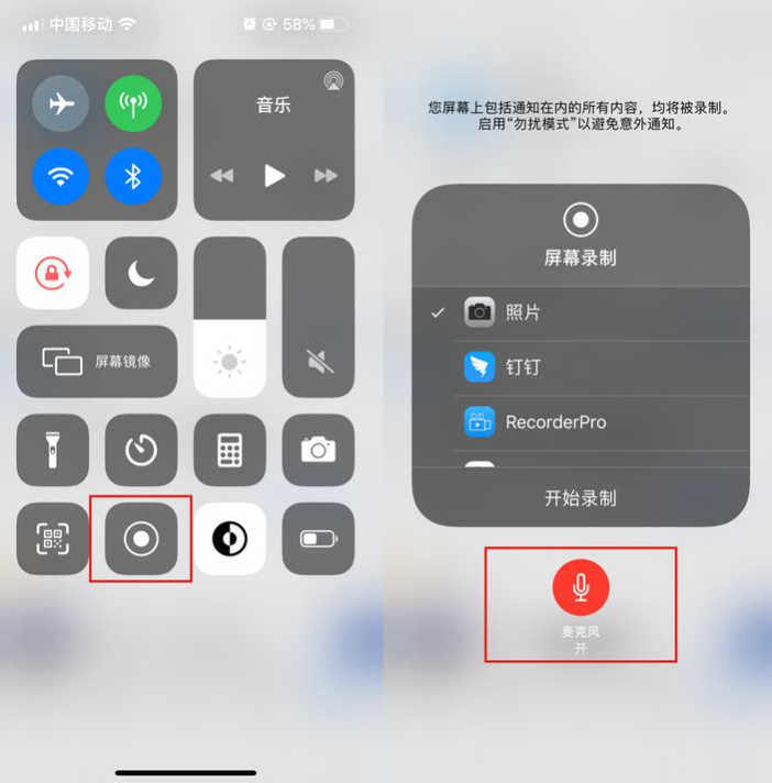 3、另外想要在录制中想要录进麦克风声音的话,在控制中心长按屏幕录制图标,然后打开麦克风录制功能即可。