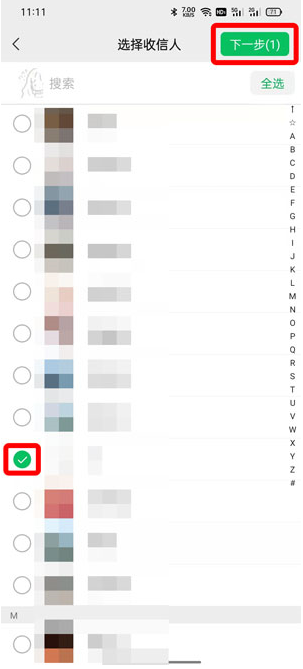 4、然后勾选需要群发消息的好友,点击右上角的【下一步】。