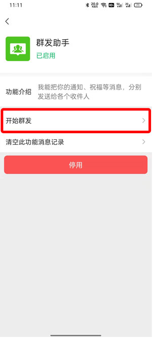 2、找到微信群发助手后,打开点击【开始群发】。