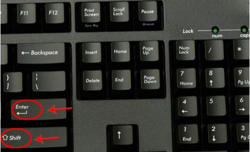 2、然后在电脑键盘上找到“Shift和Enter”两个指令键,按住“Shift”不要动,再连续敲击“Enter”键。