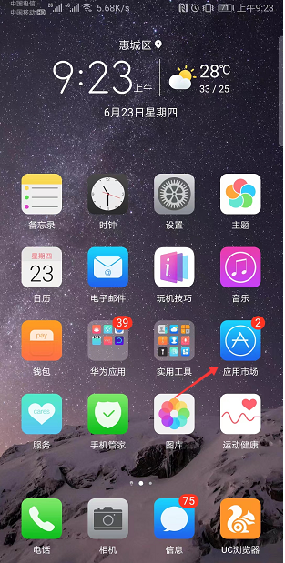 1、一般打开自己的智能手机都自带有应用市场工具,很多app软件都可以在上面获取,华为视频也不例外。我们先按图所示找到应用市场打开。