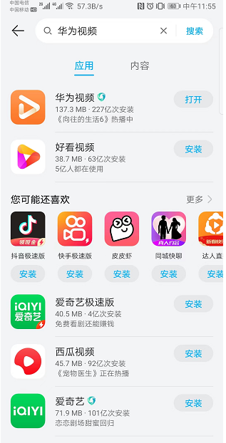 2、然后在搜索框中直接搜索“华为视频”,可以看到手机端的华为视频app,点击安装即可,这样手机便会完成整个的安装过程,在手机桌面即可找到相应的搜狗浏览器图标进入使用即可。这里小编是已经安装好的了,所以显示是可以直接打开的状态。