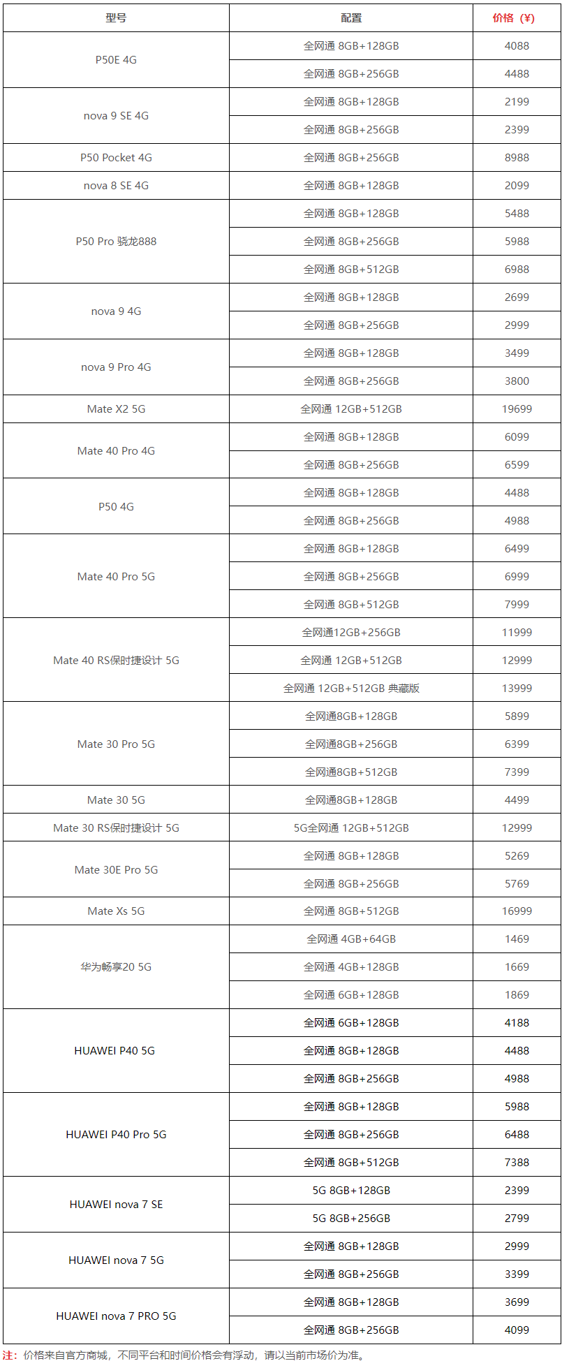 不同的华为手机型号价目基本可参照以上的表格价格,不过渠道不同,难免会有些时间和平台的上下浮动。