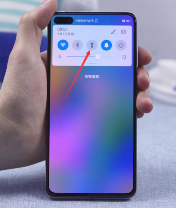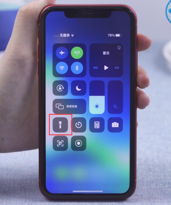 从手机右侧顶部下滑打开控制中心即可点击手电筒打开。