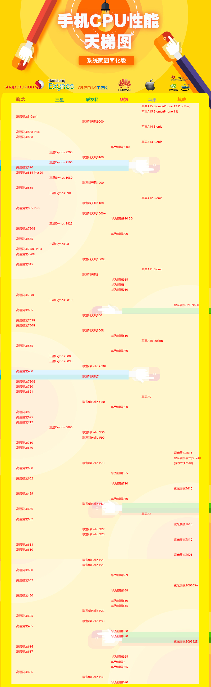手机cpu性能的高低直接影响到手机整体性能的强弱,因为在购买手机的时候我们会比较关注手机cpu性能情况。通过查看cpu性能天梯图可了解到最新的手机cpu性能排名怎么样,以下是详细的手机cpu性能天梯图情况: