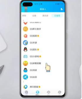 1、在QQ界面中点击页面下方的【联系人】进入界面,向左侧滑动联系人下方的选项卡找点击订阅号。