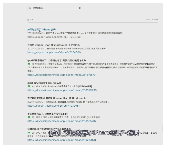 2、搜索“锁屏密码忘了”,选择“如果您忘了iPhone密码”。