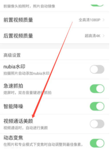 4、找到视频通话美颜一栏,点击后方的开关按钮开启即可。