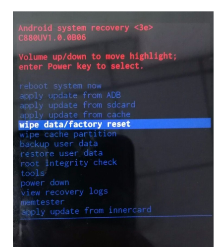 4、使用上下音量键选择选项。我们选择擦除数据/出厂记录选项,然后按电源按钮进行确认。