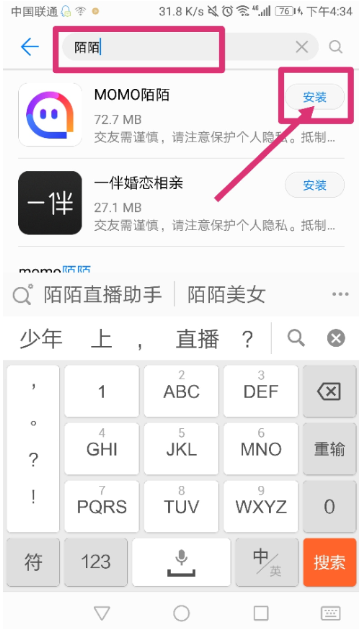 3、显示的结果中,选择下方的”MOMO陌陌“,点击安装。