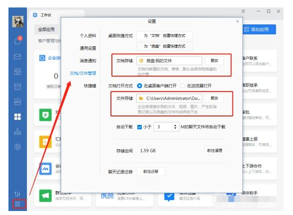 方法一:点击企业微信左下方的三条横杠图标,进入设置页面后点击文档/文件管理,在此处就可以查看到文件的保存位置。打开文件夹,即可看到所有企业微信保存的文件。但是这个方法有一个弊端,就是所有的文件、视频、图片都被存在一个文件夹里,不便于查找单个文件时。