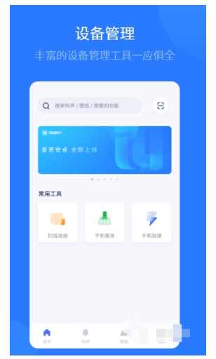 轻松连接操控手机,不仅能下载应用,还可以管理手机的一些操作,如清理垃圾、更换壁纸、更换铃声等等。
