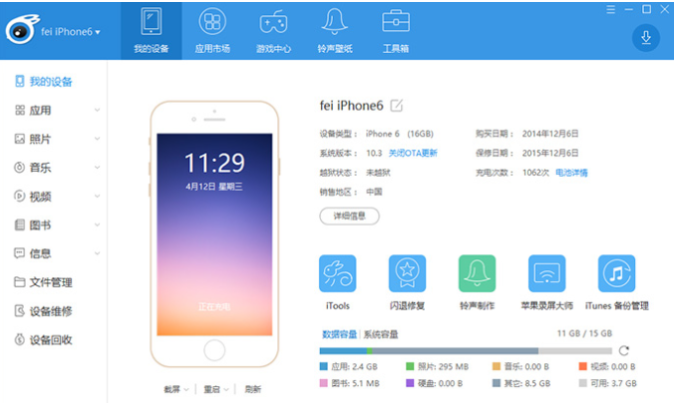 4、iTools:这时苹果官方开发的支持ios管理的软件,可以用iTools管理联系人、短信、照片、视频、应用、音乐等等,还可以免费下载iPhone正版应用。