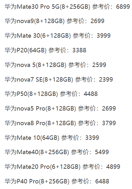 华为手机价格大全2022最新