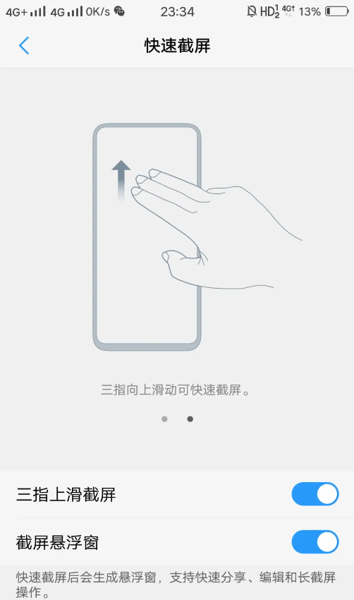 打开手机桌面的设置→找到“截屏”点击→快速截屏→将“三指上滑截屏”功能开启。这样就可以只需要三指同时向上滑动截屏了。