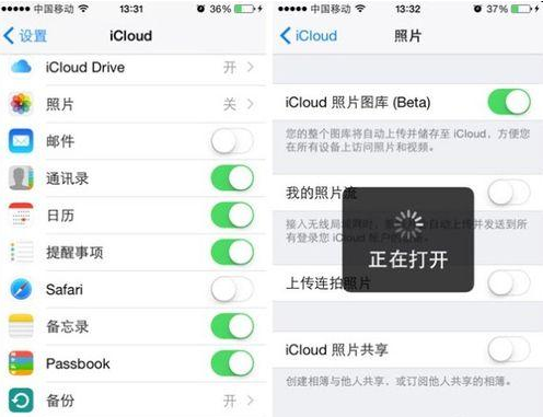 3、返回iCloud设置界面,选取和开启需要云同步的本机资料,比如照片、通讯录、备忘录等。