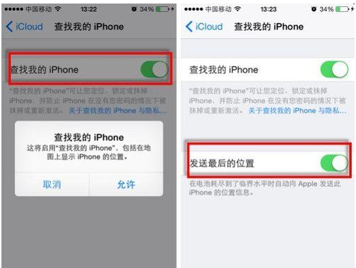 2、开启“查找我的iPhone”功能,同时开启下方“发送最后的位置”一项。