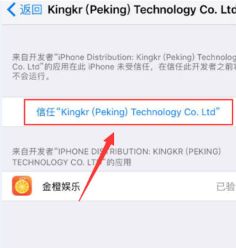 2、打开发现显示未受信任的企业级开发者,提示未受信任的企业级开发者为:kingkr(peking)Technology CO. Ltd,此为该应用开发者信息。