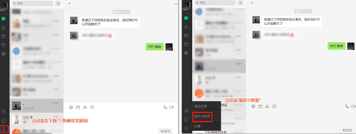 1、首先打开电脑端微信登录后点击左下角“菜单”,然后再新的界面中选择“备份与恢复”;