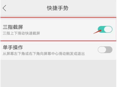 4、找到【三指截屏】右侧的开关按钮,打开“三指截屏”的开关。