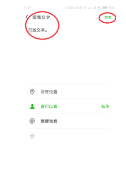 3、在“发表文字”页面输入想要发送的文字后,点击“发表”: