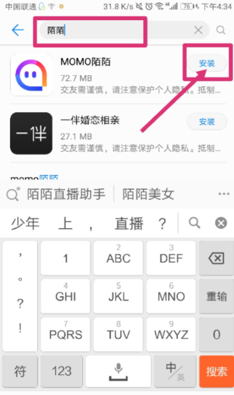 3、在显示的结果中选择”MOMO陌陌“,点击安装。