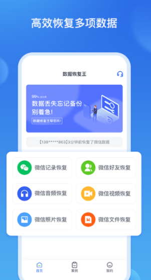 数据恢复王是一款专业的手机数据恢复软件,它通过强大的系统底层扫描检测技术,快速的找回并恢复您丢失的手机数据,支持误删及未保存微信语音、图片、视频、文件恢复。