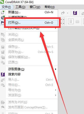 1.首先下载安装CorelDRAW软件,然后双击运行该软件,在软件界面的上方点击文件,在弹出的下拉框中点击打开选项,进入下一步。