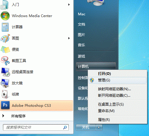 1、点击【开始】按钮,在【计算机】上右键,选择【管理】。