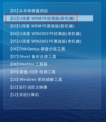 1、将U盘接入电脑后,重启电脑出现开机界面时,快速按下U盘启动快捷键,进入U启动选择第二项:【02】u深度Win8PE标准版(新机器),然后回车键进入。