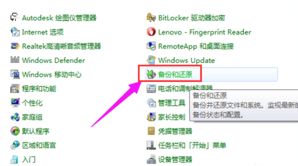 1、首先,单击电脑“开始菜单”进入“控制面板”,进入界面之后选择“备份和还原”打开。