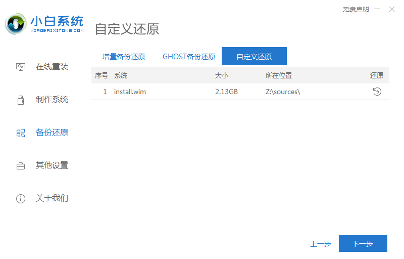 1、下载并打开小白系统软件,点击备份还原——自定义还原,小白会识别出系统文件,识别出来后点击下一步。