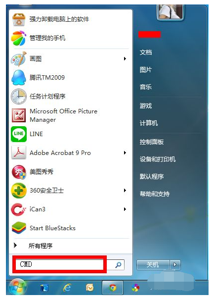 1、点击win7系统的开始菜单,在搜索框中输入cmd打开。