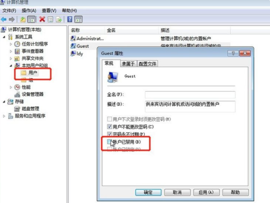 1、首先右键桌面上的计算机,然后选择管理,在弹出的【计算机管理】窗口中依次选择:系统工具、本地用户和组、用户,外媒可以找到【Guest】然后双击进去,取消勾选账户已禁用的选项。