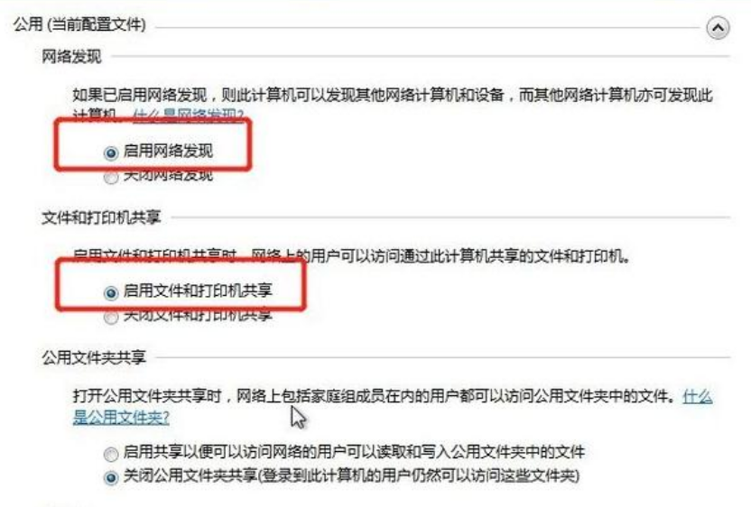 8、选中对应的网络,刚刚我的网络是公用网络,那我就选公用网络进行设置,【启用网络发现】、【启用文件和打印机共享】、【关闭密码保护共享】