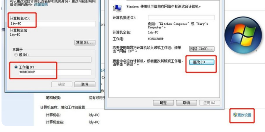 9、回到桌面右键计算机然后选择属性,在属性界面点击【更改设置】,在弹出来的计算机名选项卡里点击【更改】选项。