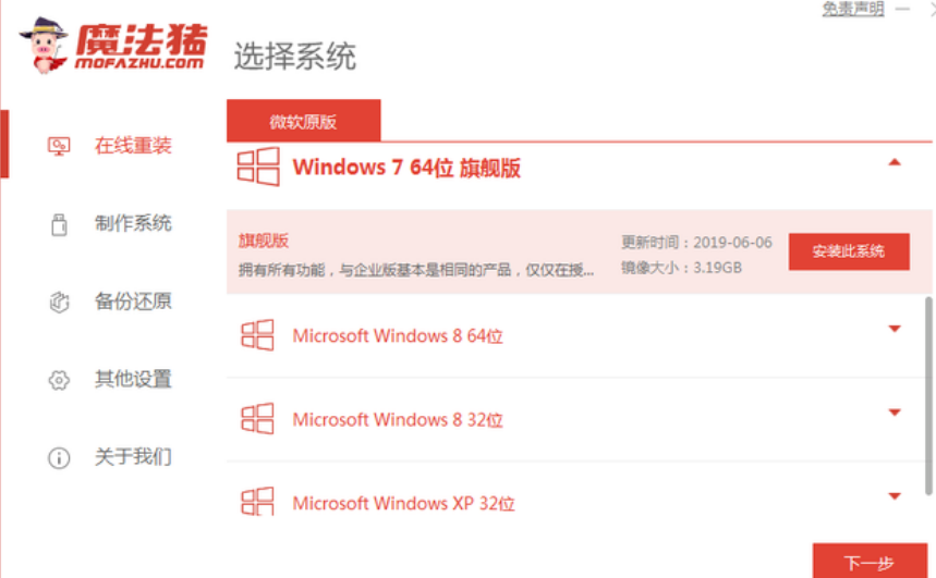 1、首先关闭电脑上的杀毒软件,备份好系统盘的重要资料后下载安装魔法猪一键重装系统软件并打开,就可以在在线重装界面选择win7系统点击安装。