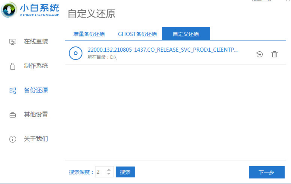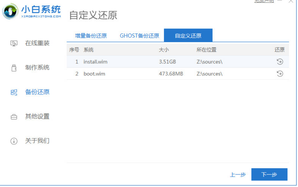 2、然后在电脑上安装好小白一键重装系统工具打开,选择备份还原,点击自定义还原进入下一步。