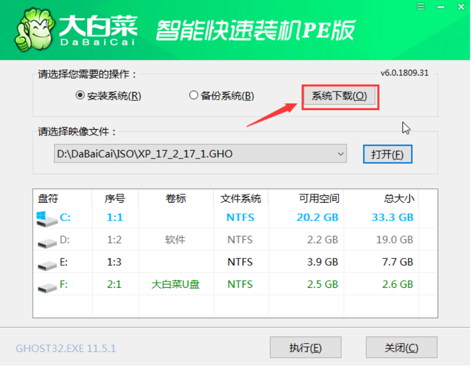 Step4:打开大白菜一键重装后,如果没有准备好系统镜像,我们可以选择在线系统下载