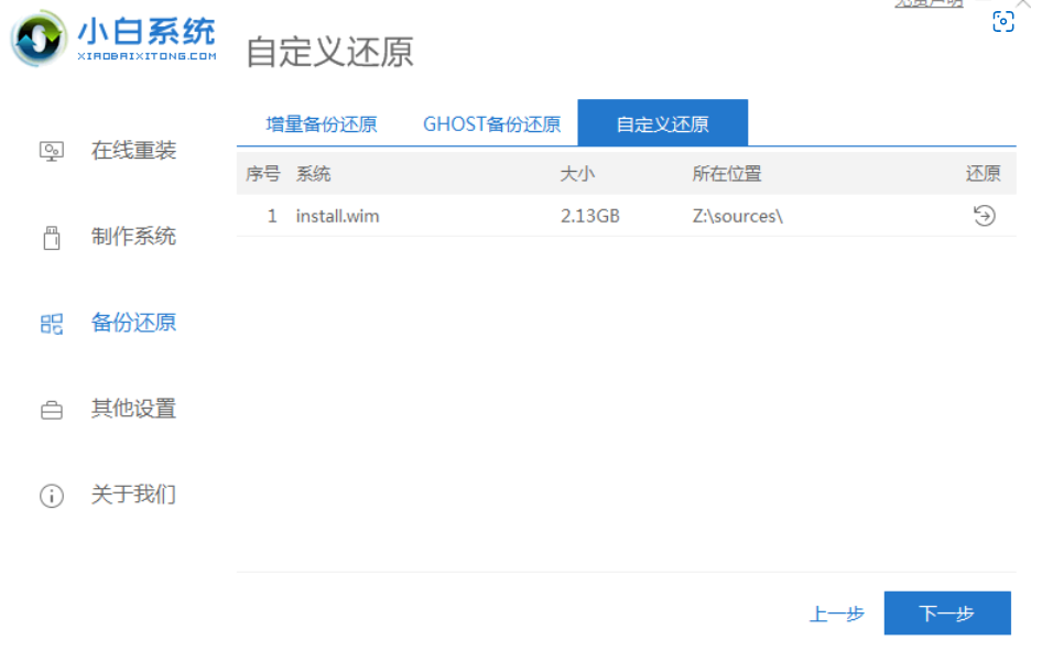 1、下载并打开小白系统软件,点击备份还原——自定义还原,小白会识别出系统文件,识别出来后点击下一步。